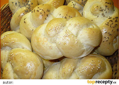 Nahlásit chybu v receptu. V míse smíchejte lžíce mouky, cukr, droždí a 1ml vlažného mléka. Až se vytvoří bubliny, přidejte zbytek. Vykynuté těsto rozdělte na až dílků, vyválejte je na prameny a upleťte housky.