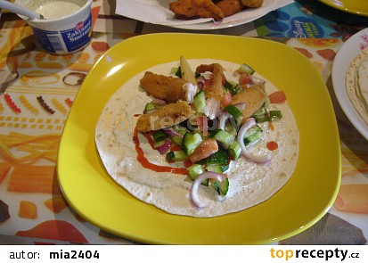 Přináším Vám další tip na lehký a svěží oběd. Na každou z nich navršíme pár salátových listů, pokrájenou cibuli, nakrájená rajčata a okurku, kuřecí maso a dip. Zavineme a můžeme podávat.