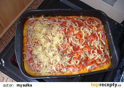 Těsto nalijeme na vymazaný a vysypaný pekáč. Potřeme kečupem, posypeme kroužky nakrájené cibule, kolečky salámu (šunky) a hustě posypeme strouhaným sýrem. Upečeme v předehřáté troubě dozlatova.