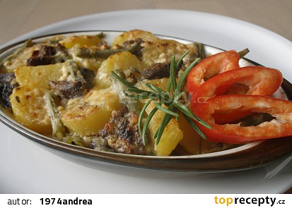 Opepříme, osolíme, vše promícháme a odstavíme z ohně. Do zapékací misky naskládáme brambory, nasypeme na ně směs z pánve, zalijeme smetanou, posypeme nastrouhaným sýrem a dáme do trouby zapéct při 2°C asi min. Zařazení: Maso Oběd Večeře Pečení Smažení Slovník pojmů.